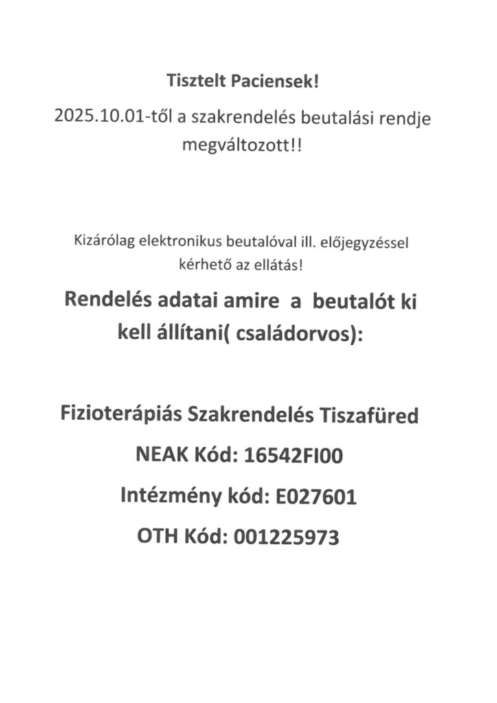 - Otthonában a helyileg illetékes reumatológus szakorvos Berekfürdőre (szakrendelő kód: 165421401) írja fel a kezeléseket. A vénnyel és a kezelőlappal a TB pénztárunknál időpontot (06-59-519029) kell egyeztetnie. A kezeléseket a felírástól számított 30 napon belül kell elkezdeni, és a megkezdés első napjától, 8 héten belül szükséges befejezni. A kúra befejezését követő 3 héten belül a beteg a kezelőlapjával köteles a gyógyászati ellátást elrendelő orvosnak, ellenőrző vizsgálat során átadni.